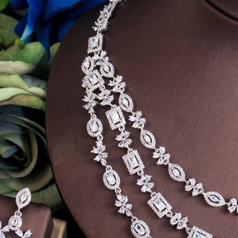Elevate your elegance with this luxury cubic zirconia jewelry set, featuring a glamorous three-layered necklace and matching statement earrings. Crafted with sparkling cubic zirconia stones and detailed metallic accents, this set is designed to make you shine at every special event.
